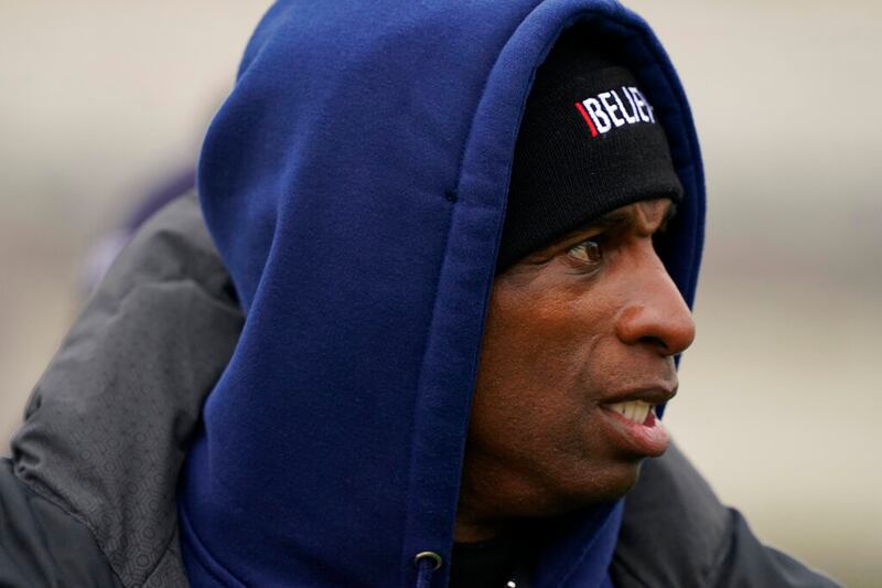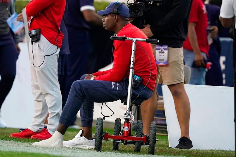 Deion Sanders Jackson State head coach Deion Sanders watches his team as they play Prairie View during the first half of the Southwestern Athletic Conference championship NCAA college football game, Saturday, Dec. 4, 2021, in Jackson, Miss. (AP Photo/Rogelio V. Solis) (Rogelio V. Solis/AP)
