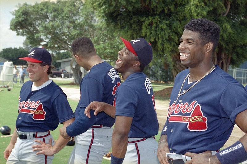 Deion Sanders Atlanta Braves non-rooster outfield Deion Sanders, right, shares a light moment with teammate Ron Gant in West Palm Beach, March 3, 1991. Sanders, who is a defensive back for the Atlanta Falcons, is attempting to become the first player in 30 years to play two sports in the same city. (AP Photo) (RICHARD DREW/AP)