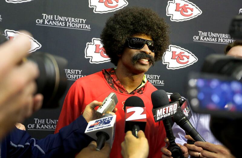 Deion Sanders Deion Sanders, dressed as Leon Sandcastle talks to the media at the Kansas City Chiefs training facility Thursday, March 28, 2013, in Kansas City, Mo. Sanders, an NFL Network analyst and former NFL Defensive Player of the Year, starred in the network's advertisement showing Sanders trying to become the next rookie sensation by donning a wig and mustache and participating in the NFL Scouting Combine as the fictitious Leon Sandcastle. (AP Photo/Charlie Riedel) (Charlie Riedel/AP)