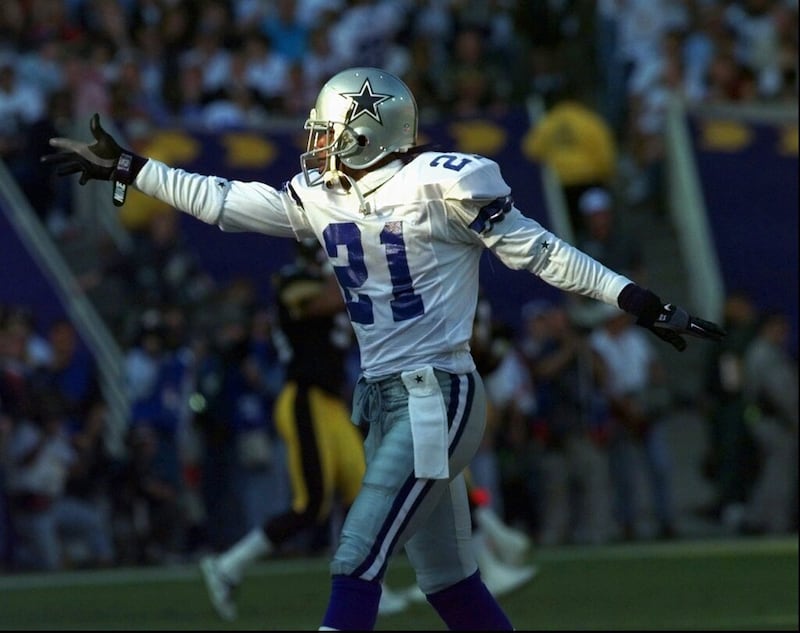 Deion Sanders Deion Sanders acknowledges the crowd, Sunday, Jan. 15, 1995, as his San Francisco 49ers' defeated the Dallas Cowboys, 38-28, to win the NFC Championship. (AP Photo/Paul Sakuma) (Paul Sakuma/AP)