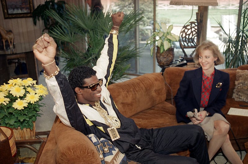 Deion Sanders Florida State's Deion Sanders, left, reacts as he sits with television reporter Andrea Kremer, at his agent's suburban home in Winnetka, Ill., on April 23, 1989. Sanders was selected by the Atlanta Falcons in the first round of the NFL draft. Sanders, a two-time All-American cornerback at FSU, was the fifth player selected in the first round. (AP Photo) (DAVID BANKS/AP)
