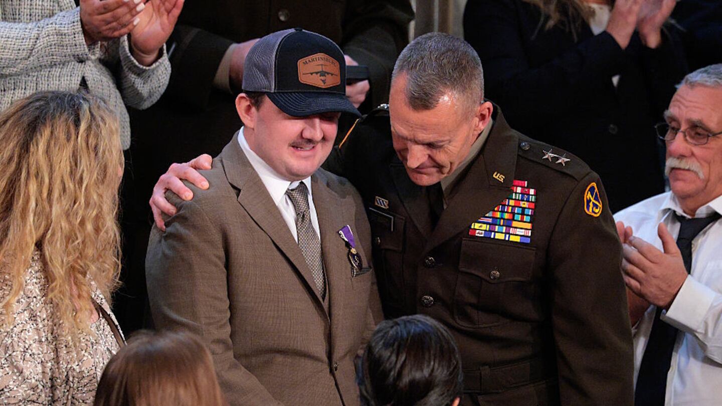 “Nice to see -- he’s a good-looking guy. Nice to see you. Thanks, Andrew. Thank you very much. So, Andrew, while you’re up, now I’m going to ask a highly respected General James Seward to present Staff Sgt. Andrew Wolf and the great family of Sarah Beckstrom with the award created by our late great president, George Washington himself.